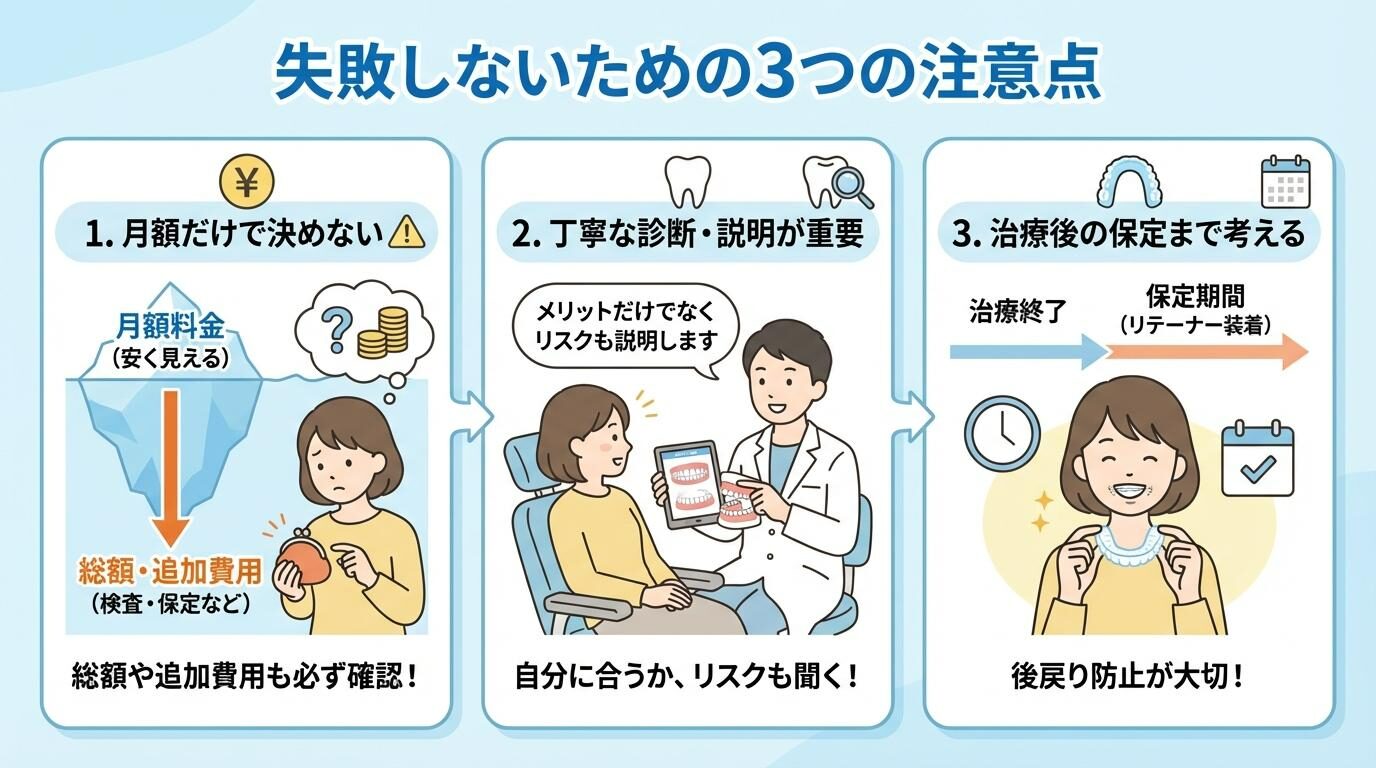 マウスピース矯正は、サービス選びだけでなく、治療の進め方や確認不足でも後悔しやすくなります。
