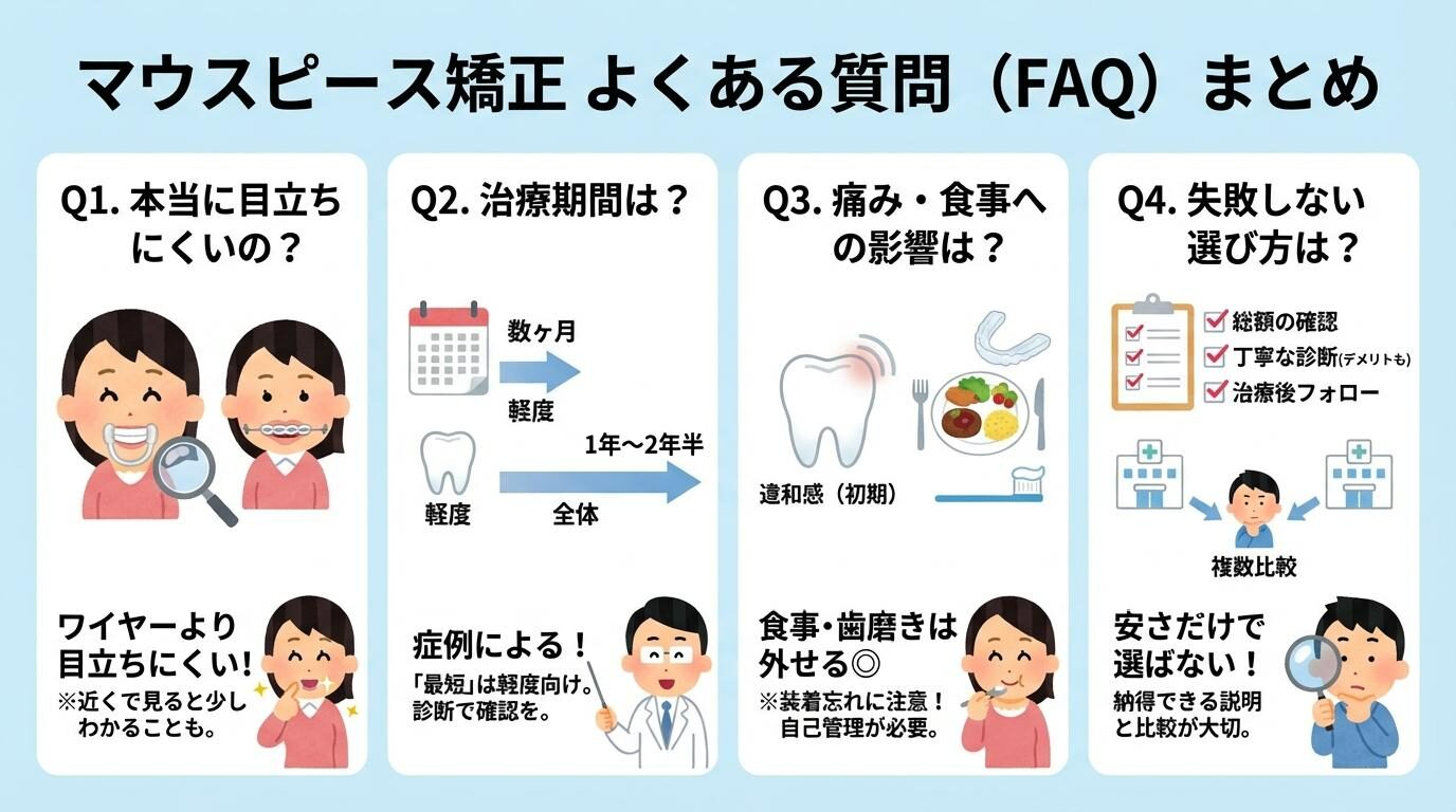 ここでは、マウスピース矯正を検討するときに気になりやすい疑問をまとめます。
