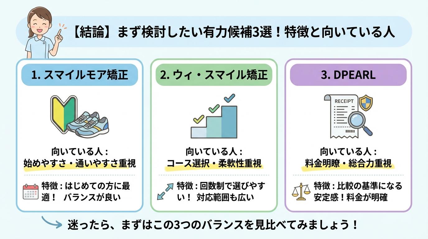 迷ったら、まずはスマイルモア矯正、ウィ・スマイル矯正、DPEARLの3つから比較してみるのがおすすめです。
