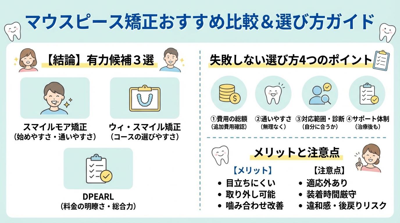 マウスピース矯正を選ぶときは、人気や知名度だけで決めるより、見るポイントを先に知っておくほうが失敗しにくいです。