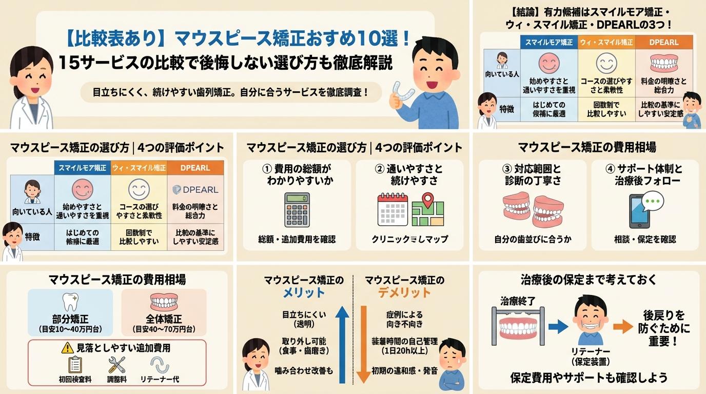 今回は、マウスピース矯正 おすすめ10選を比較しながら、選び方や費用相場、メリット・デメリットまで解説しました。