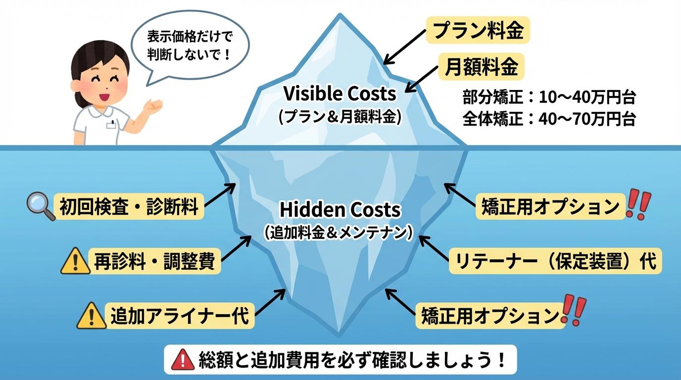 初回検査料、再診料、追加マウスピース代、リテーナー(保定装置)代などが別で、想像より費用がふくらむこともありますし、初回検診料や再診料などが提携クリニックごとに異なると案内しているサービスもあります。