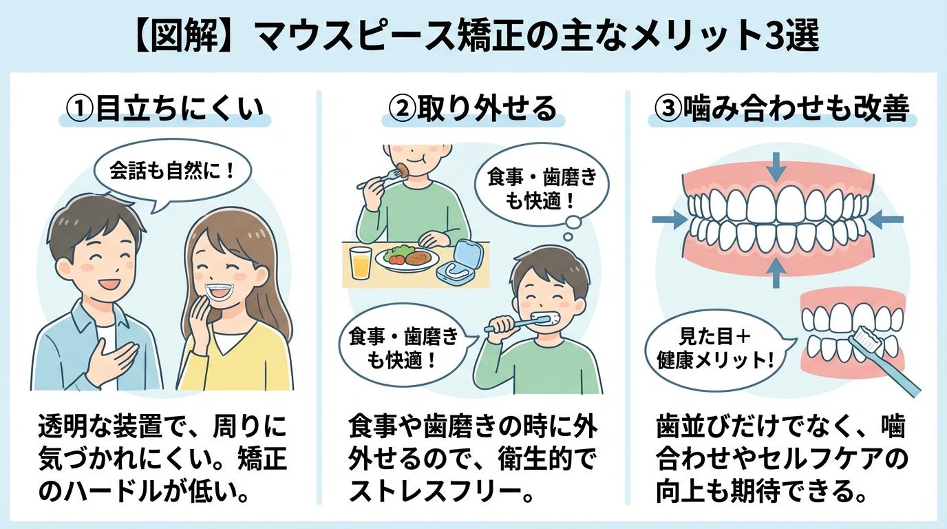 ワイヤー矯正と比べて手軽で目立ちにくいが自己管理の負担はある