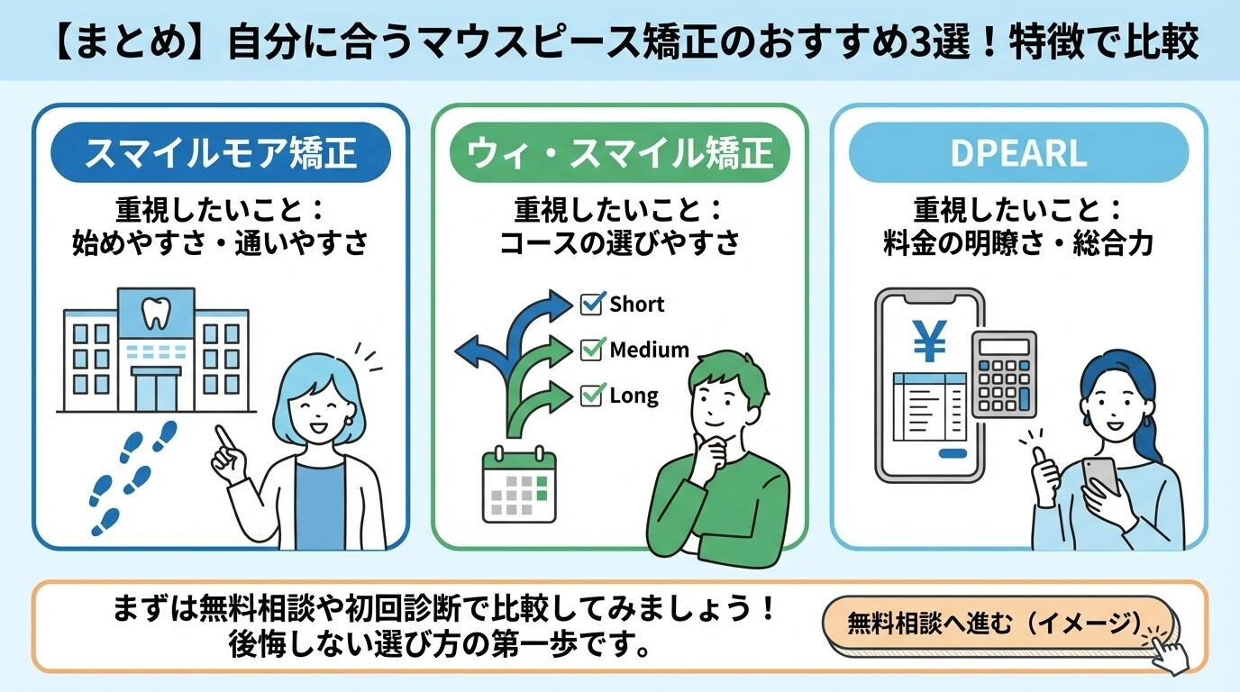 まとめ|まずはスマイルモア矯正、ウィ・スマイル矯正、DPEARLの3つから比較して、自分に合うマウスピース矯正を見つけよう