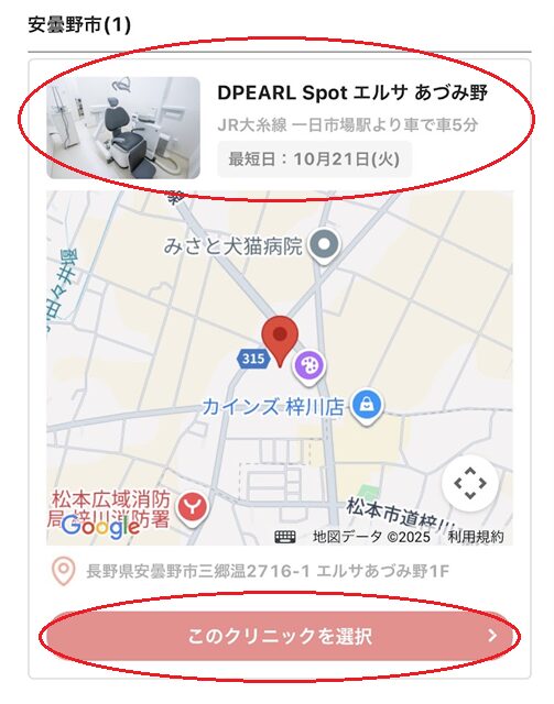 「DPEARL Spot エルサ あづみ野」を選択し、「このクリニックを選択」をクリック(タップ)します。