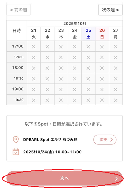 カレンダーから希望する日時を選択し、「次へ」をクリック(タップ)します。