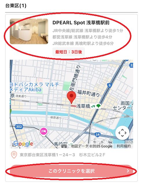 「DPEARL Spot 浅草橋駅前」を選択し、「このクリニックを選択」をクリック(タップ)します。