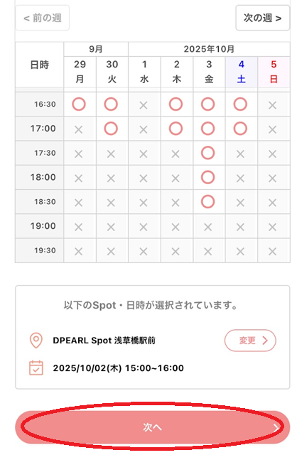 カレンダーから希望する日時を選択し、「次へ」をクリック(タップ)します。