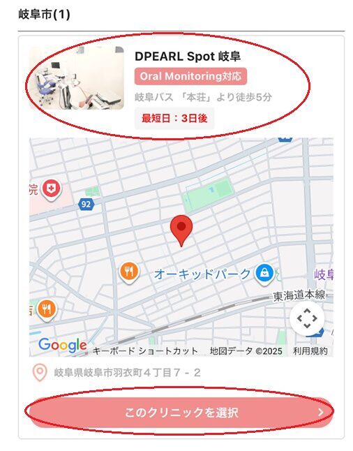 「DPEARL Spot 岐阜」を選択し、「このクリニックを選択」をクリック(タップ)します。