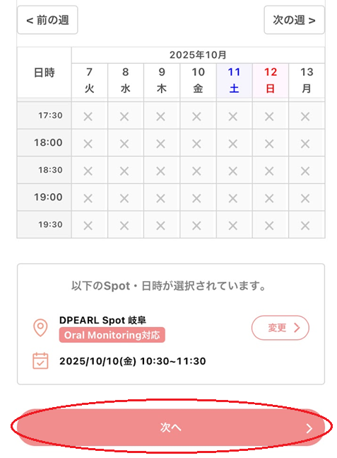 カレンダーから希望する日時を選択し、「次へ」をクリック(タップ)します。