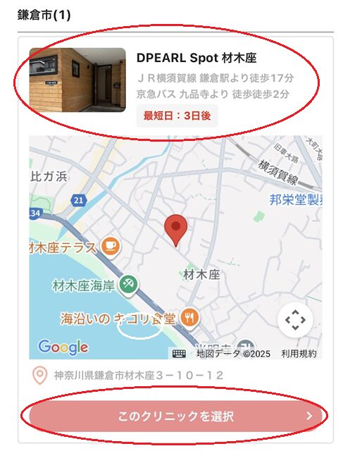 「DPEARL Spot 材木座」を選択し、「このクリニックを選択」をクリック(タップ)します。