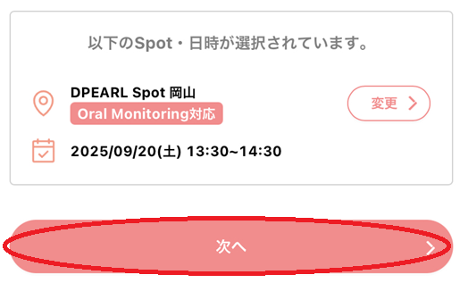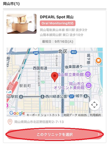「DPEARL Spot 岡山」を選択し、「このクリニックを選択」をクリック(タップ)します。