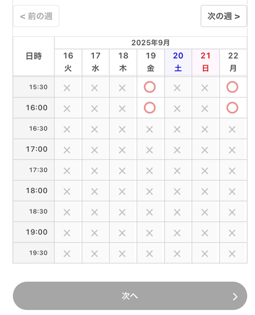 カレンダーから希望する日時を選択し、「次へ」をクリック(タップ)します。