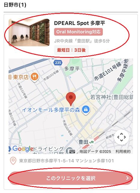 「DPEARL Spot 多摩平」を選択し、「このクリニックを選択」をクリック(タップ)します。