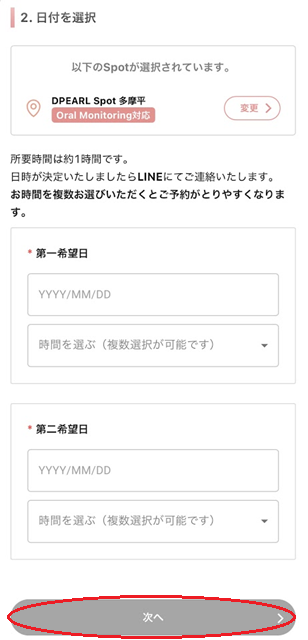 第一希望・第二希望の日時を選択し、「次へ」をクリック(タップ)します。