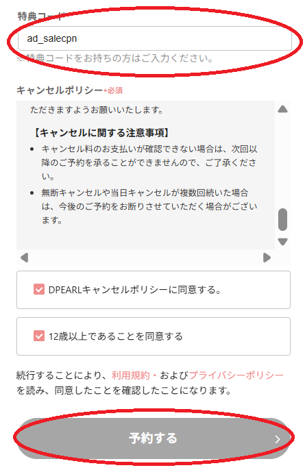 名前やメールアドレスなどの必須項目を入力後、「キャンセルポリシーに同意する」「12歳以上であることを同意する」にチェックを入れ、「予約する」をクリック(タップ)します。