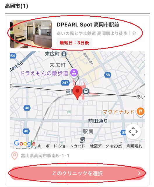 「DPEARL Spot 高岡市駅前」を選択し、「このクリニックを選択」をクリック(タップ)します。
