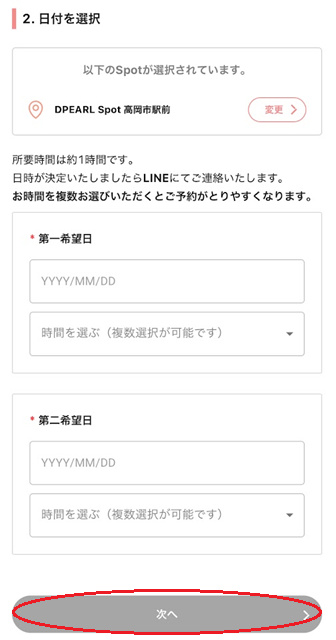 第一希望日時・第二希望日時を選択し、「次へ」をクリック(タップ)します。