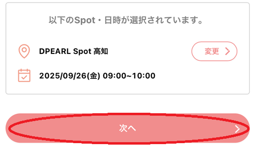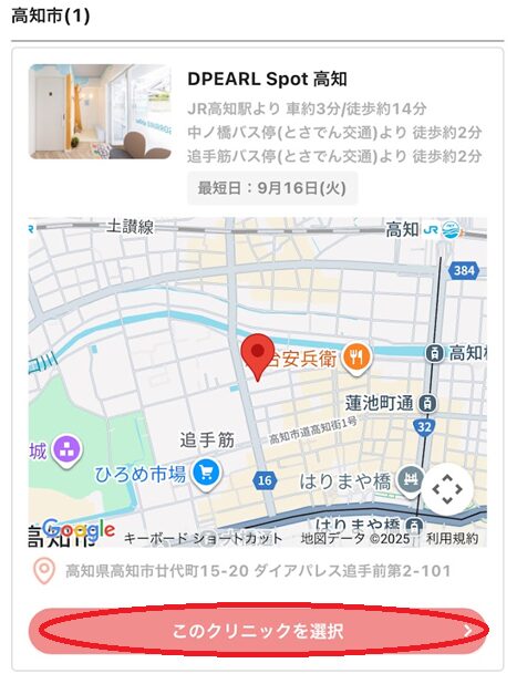 「DPEARL Spot 高知」を選択し、「このクリニックを選択」をクリック(タップ)します。