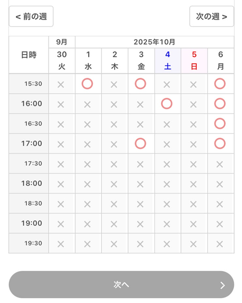 カレンダーから希望する日時を選択し、「次へ」をクリック(タップ)します。