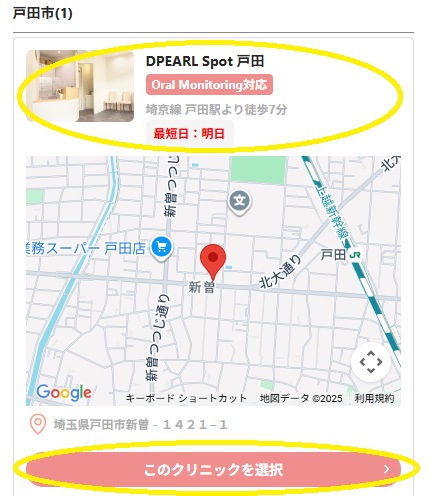 「DPEARL Spot 戸田」を選択し、「このクリニックを選択」をクリック(タップ)します。