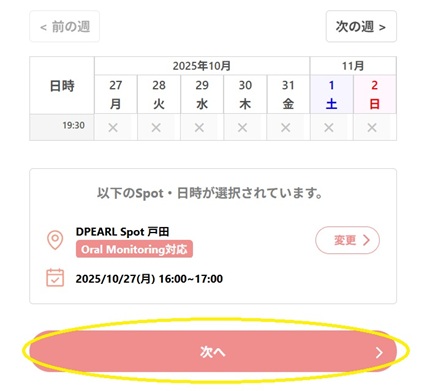 カレンダーから希望する日時を選択し、「次へ」をクリック(タップ)します。