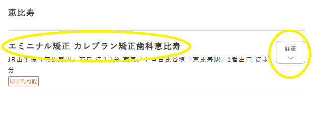 「カレブラン矯正歯科恵比寿」を選択し、「詳細」をクリック(タップ)します。