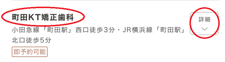 「町田KT矯正歯科」を選択し、「詳細」をクリック(タップ)します。