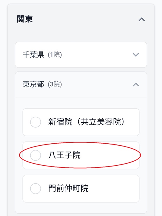 予約希望エリアは「関東・東京都」を選択し、「八王子院」をクリック(タップ)します。