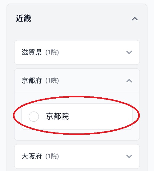 予約希望エリアは「近畿・京都府」を選択し、「京都院(たかもり歯科医院)」をクリック(タップ)します。