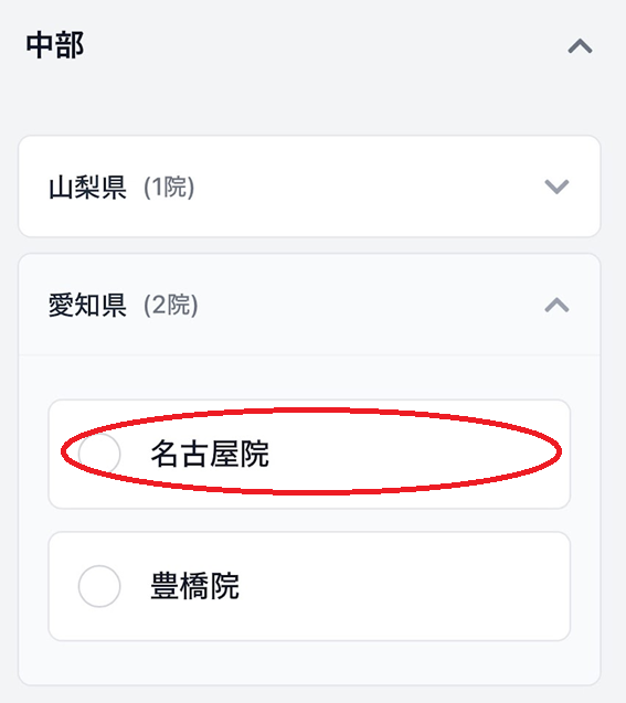 予約希望エリアは「中部・愛知県」を選択し、「名古屋院」をクリック(タップ)します。
