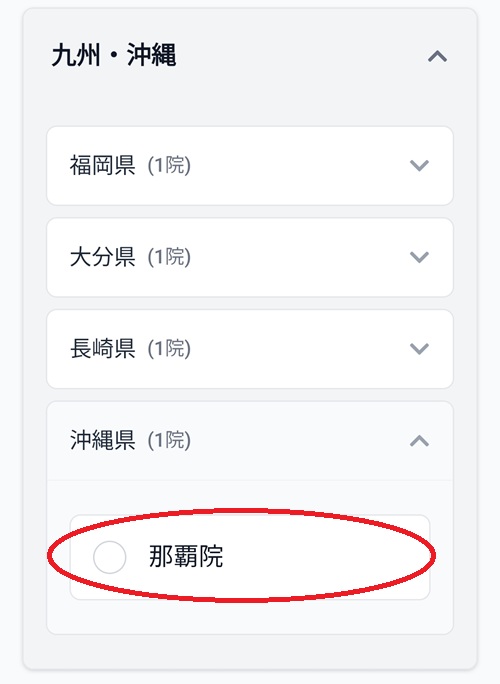 予約希望エリアは「九州沖縄・沖縄県」を選択し、「那覇院」をクリック(タップ)します。