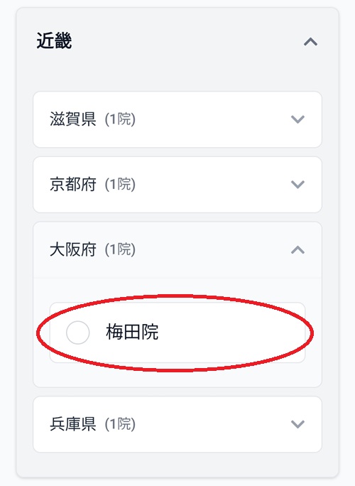 予約希望エリアは「近畿・大阪府」を選択し、「梅田院」をクリック(タップ)します。