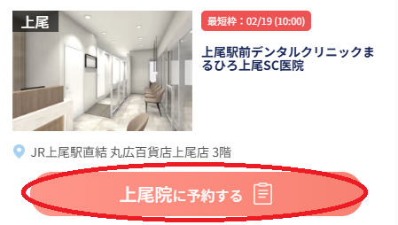 公式サイトにある「無料で今すぐ予約」をクリック(タップ)し、予約クリニック(上尾駅前デンタルクリニックまるひろ上尾SC医院)を選択、希望日時など必要項目を入力して予約します。