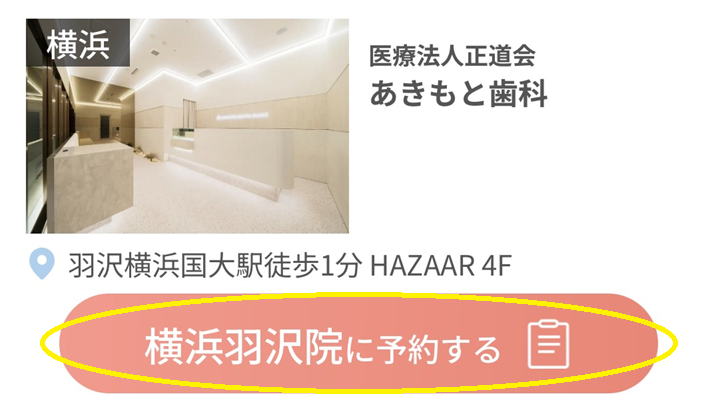 公式サイトにある「無料で今すぐ予約」をクリック(タップ)し、予約クリニック(あきもと歯科)を選択、希望日時など必要項目を入力して予約します。