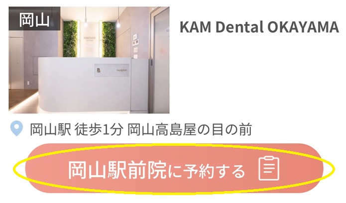 公式サイトにある「無料で今すぐ予約」をクリック(タップ)し、予約クリニック(KAM Dental OKAYAMA)を選択、希望日時など必要項目を入力して予約します。