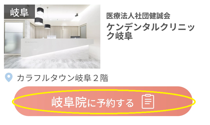 公式サイトにある「無料で今すぐ予約」をクリック(タップ)し、予約クリニック(ケンデンタルクリニック岐阜)を選択、希望日時など必要項目を入力して予約します。