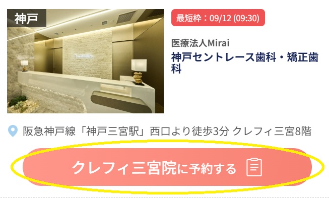 公式サイトにある「無料で今すぐ予約」をクリック(タップ)し、予約クリニック(神戸セントレース歯科・矯正歯科)を選択、希望日時など必要項目を入力して予約します。