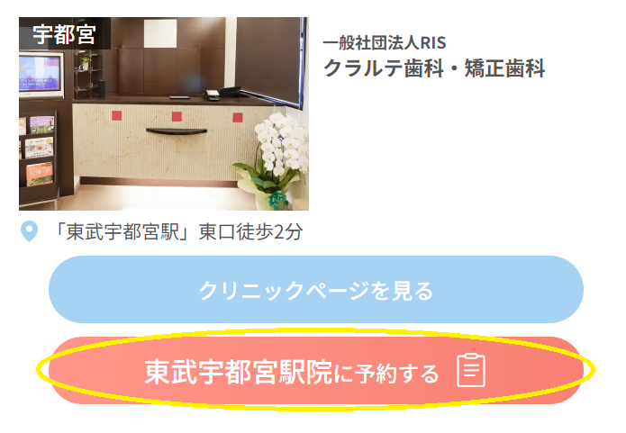 公式サイトにある「無料で今すぐ予約」をクリック(タップ)し、予約クリニック(クラルテ歯科・矯正歯科)を選択、希望日時など必要項目を入力して予約します。