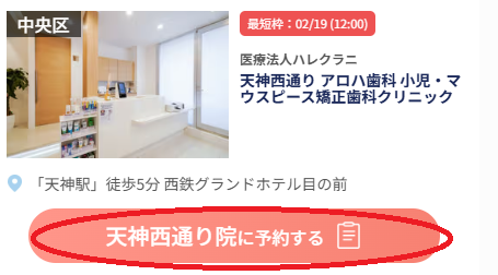 公式サイトにある「無料で今すぐ予約」をクリック(タップ)し、予約クリニック(天神西通り アロハ歯科 小児・マウスピース矯正歯科クリニック)を選択、希望日時など必要項目を入力して予約します。