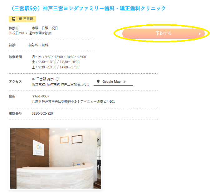 「神戸三宮ヨシダファミリー歯科・矯正歯科クリニック」の予約ボタンで予約しましょう。