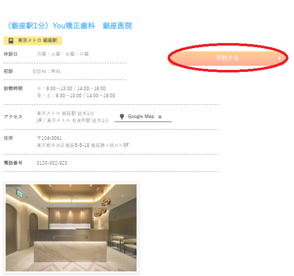 「You矯正歯科銀座医院」の予約ボタンで予約しましょう。